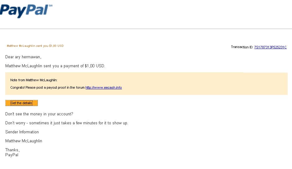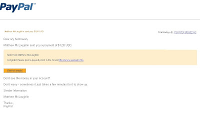 I am very happy at all while getting the first payment of earneasycash.info, at first I guess this just fantasy just to get money from online. But after I try in day after day I have managed in less than 10 days for $ 1 via my paypal. If you do not believe look at the proof of delivery transfers from earneasycash.info on behalf of Matthew McLaughlin.